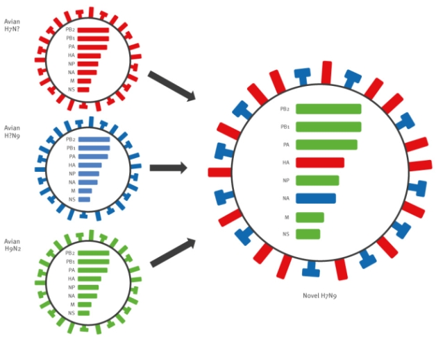Ο νέος ιός της γρίπης A(H7N9) είναι πιθανόν να έχει αποκτήσει τα γονίδια ΗΑ από έναν ιό της γρίπης των πτηνών H7 και αγνώστου υπότυπου NA, τα NA γονίδια από έναν ιό της γρίπης των πτηνών N9 και άγνωστου υπότυπου ΗΑ και τα υπόλοιπα έξι ιικά τμήματα από τον ιό της γρίπης H9N2 που κυκλοφορεί στα πουλερικά (H=αιμοσυγκολλητίνη, N=νευραμινιδάση) Οι περισσότεροι ιοί γρίπης Α(Η7) έχουν αναγνωριστεί σε όλο τον κόσμο σε άγρια πτηνά και σε πουλερικά. Στον άνθρωπο είναι ασυνήθιστη η λοίμωξη από το στέλεχος Α(Η7), έχουν όμως διαπιστωθεί κατά το παρελθόν περιστατικά λοίμωξης ανθρώπων από ιούς Α(H7N2), Α(H7N3) και Α(H7N7), στην Ολλανδία, την Ιταλία, τον Καναδά, τις ΗΠΑ, το Μεξικό και το Ηνωμένο Βασίλειο, κυρίως κατά την διάρκεια επιδημιών σε πτηνοτροφεία σε άτομα που είχαν άμεση επαφή με άρρωστα πτηνά, με τις περισσότερες λοιμώξεις να εκδηλώνονται κυρίως με επιπεφυκίτιδα και συμπτώματα από το ανώτερο αναπνευστικό, με την εξαίρεση ενός θανάτου, ο οποίος συνέβη στην Ολλανδία.